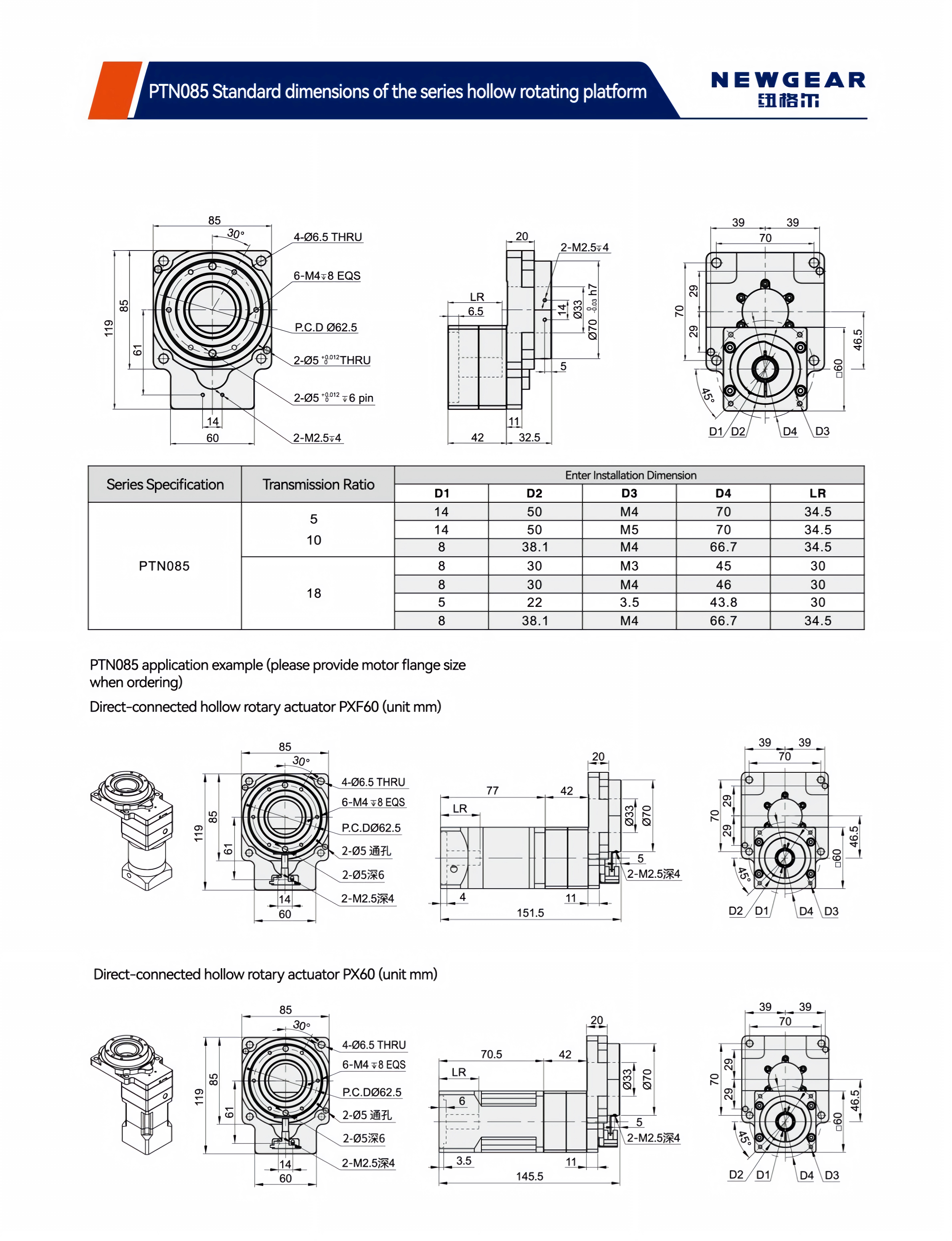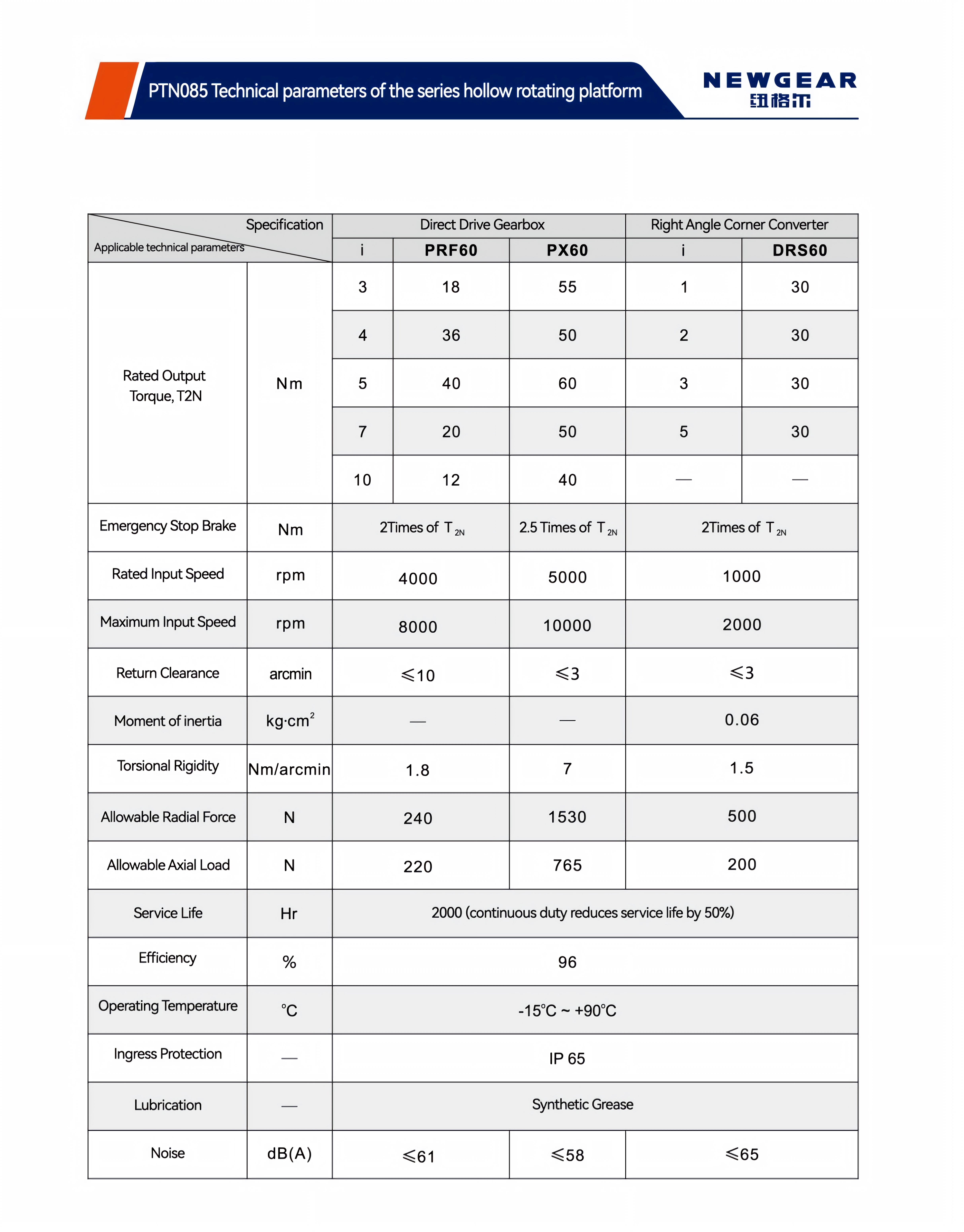 โต๊ะหมุนแบบกลวงอเนกประสงค์ PTN085 สามารถใช้งานร่วมกับมอเตอร์สเต็ปเปอร์ NEMA 17 และ 23 และมอเตอร์เซอร์โว AC ขนาด 50W ถึง 400W ได้ มีอัตราทดเกียร์ 5, 10 และ 18:1 มีระยะคลอน ≤1 arc-min และความแม่นยำในการทำซ้ำ ±15 arc-sec โครงสร้างแข็งแรงด้วยตลับลูกปืนแบบไขว้และดีไซน์แบบรูทะลุ ทำให้รับน้ำหนักได้สูงและเดินสายได้ง่าย มีระดับการป้องกัน IP40 เหมาะสำหรับสภาพแวดล้อมอุตสาหกรรมทั่วไป ยิ่งไปกว่านั้น ยังสามารถใช้งานร่วมกับเกียร์ทดรอบแบบดาวเคราะห์ PX60/PRF60 ของเราได้อย่างยืดหยุ่น เพื่อเพิ่มตัวเลือกแรงบิดและอัตราทดความเร็ว จึงเป็นโซลูชันแบบหมุนที่แข็งแรงและปรับเปลี่ยนได้สำหรับงานระบบอัตโนมัติที่หลากหลาย